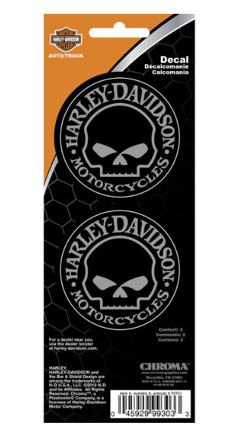 Enhance your vehicle or gear with the Willie G Skull Vinyl Decal Set, featuring two decals each measuring 3’’ X 8’’. These decals showcase the iconic Willie G Skull design, perfect for adding a touch of Harley-Davidson® style to your surroundings. Made from durable vinyl, they are easy to apply and designed to withstand outdoor conditions. Whether on your car, motorcycle, or any smooth surface, these decals are a bold statement of your passion for Harley-Davidson®.