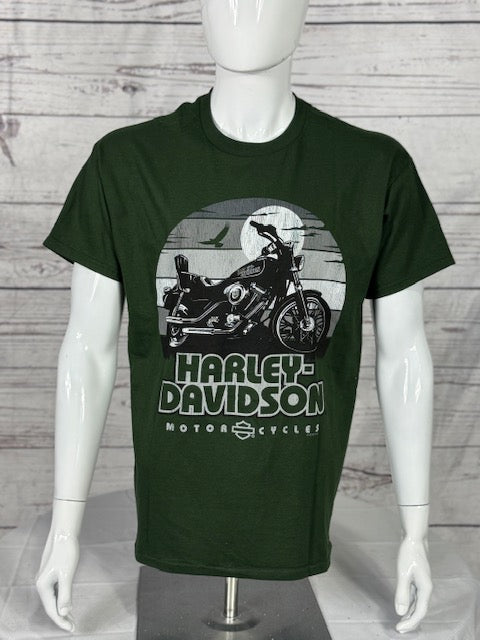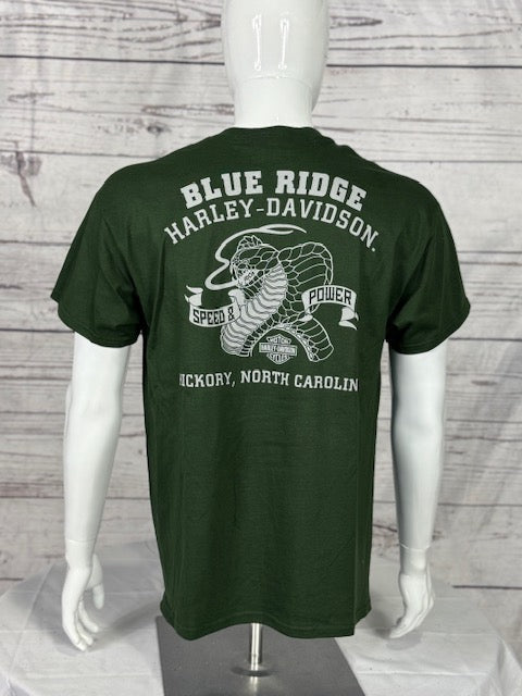 Feel the freedom in the Harley-Davidson® Men’s Ambience Tee. This deep forest green short sleeve rolls out a vintage cruiser graphic beneath a moonlit sky, with bold HARLEY-DAVIDSON® lettering anchoring the scene. Perfect for riders who crave both the open road and a touch of retro grit. Crafted from breathable cotton for all-day comfort. The back strikes fast with our exclusive Blue Ridge Harley-Davidson® cobra design, wrapping you in “Speed & Power” straight out of Hickory, North Carolina.