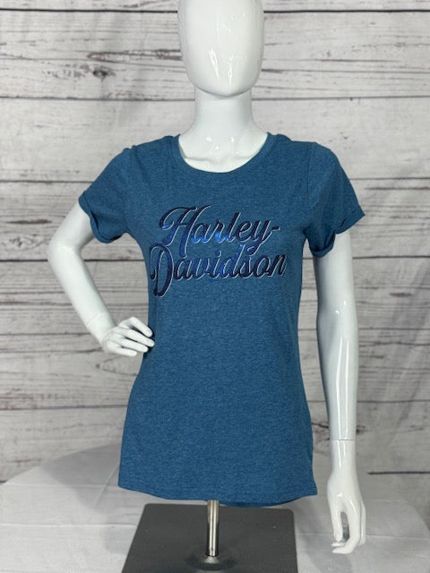 Bring the cool tones with the Harley-Davidson® Women’s Atmosphere Short Sleeve Tee. Featuring a Harley-Davidson® script across the chest in shades of blue and violet, this tee delivers understated style with a hint of shine. The soft heathered blue fabric offers a lightweight, breathable fit, while rolled sleeve cuffs add an effortlessly casual finish. Perfect for day rides or kicking back, it’s designed for comfort with a touch of polish. The back proudly displays our custom Blue Ridge Harley-Davidson® logo with frosted wing graphics and “Hickory, North Carolina” script, making it a must-have for any Harley® fan with an eye for cool, relaxed style.