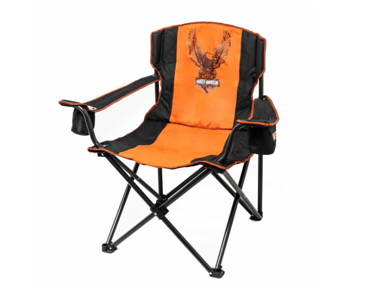 Experience comfort and convenience with the Harley-Davidson® Black and Orange Folding Chair. Crafted from durable 600 Denier polyester fabric, this chair features the Bar & Shield Eagle logo on both the front and back. The powder-coated steel tube frame supports a padded seat and backrest for added comfort. It includes a cup holder in the right armrest and a cooler pack with a zipper closure in the left armrest, branded with the Harley-Davidson® logo, and capable of holding up to 3 cans. The chair folds easily for transport and storage in the included Harley-Davidson carry bag.