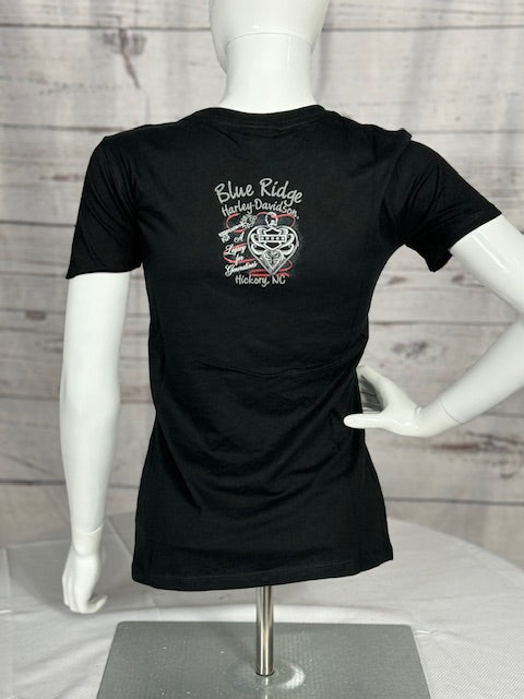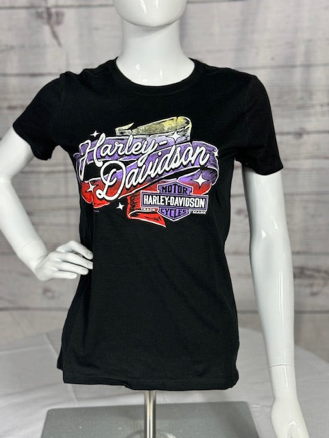 Shine with confidence in the Women's Banner Sparkle Short Sleeve T-Shirt. This eye-catching top features a bold ombre banner design across the front, adding a touch of flair to your look. The back is adorned with a coordinating custom Blue Ridge Harley-Davidson logo, completing the stylish ensemble. Perfect for Harley-Davidson® enthusiasts, this t-shirt offers a comfortable fit and a standout design, making it a must-have for your wardrobe.