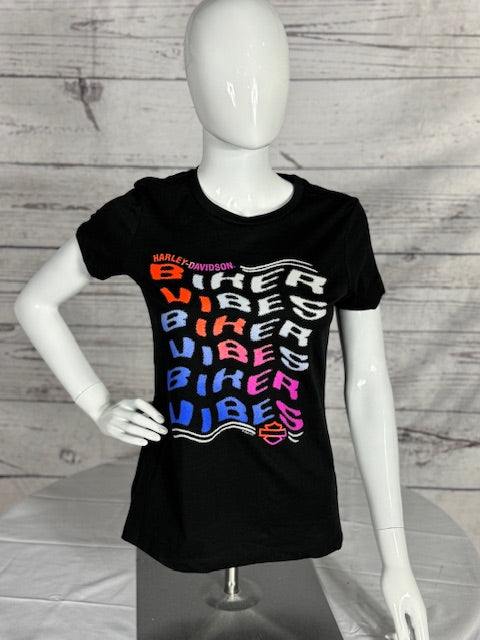 Bring bold energy to your look with this women’s black short-sleeve t-shirt, featuring a fun and colorful "Biker Vibes" repeating logo across the front. The vibrant design radiates positivity and a love for the ride, making it a perfect statement piece for any Harley enthusiast.