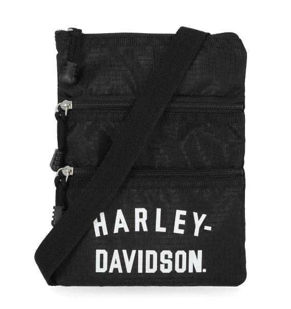 The Harley-Davidson® Women's Black Ripstop Crossbody Bag combines style with functionality. Made from durable, water-resistant nylon, this bag features contrasting silver zippers and white Harley-Davidson® script for an elevated look. The adjustable, removable strap allows for customizable comfort, while the top zip opening and two front zip pockets offer ample storage for your essentials.