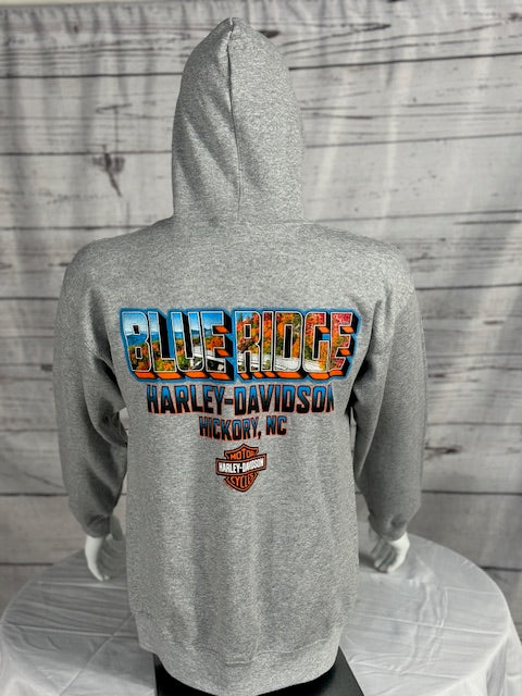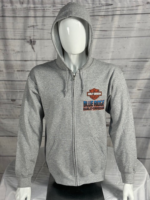 Introducing our exclusive Men's Grey Zip-Up Hoodie, a must-have for any Harley-Davidson enthusiast. Crafted for comfort and style, this hoodie features our custom Blue Ridge Harley-Davidson logo, showcasing the iconic parkway viaduct scene on the back, symbolizing the spirit of adventure and freedom that defines the Harley-Davidson legacy. Complete with a coordinating logo on the front chest, this hoodie is a statement piece that proudly represents your passion for Harley-Davidson and the Blue Ridge Parkway. Whether you're hitting the open road or relaxing with friends, our Men's Grey Zip-Up Hoodie is the ultimate expression of Harley-Davidson style and heritage.
