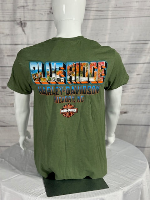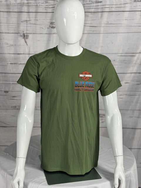 Unleash your love for the Harley-Davidson brand with our Men's Military Green T-shirt. Crafted with high-quality material, this shirt showcases the custom Blue Ridge Harley-Davidson parkway viaduct logo across the back and matching emblem on the chest, serving as a testament to your unwavering devotion. From social gatherings to sunny rides, this classic piece is ideal for all kinds of escapades. Wear it with pride and let your Harley-Davidson spirit radiate with each and every wear!