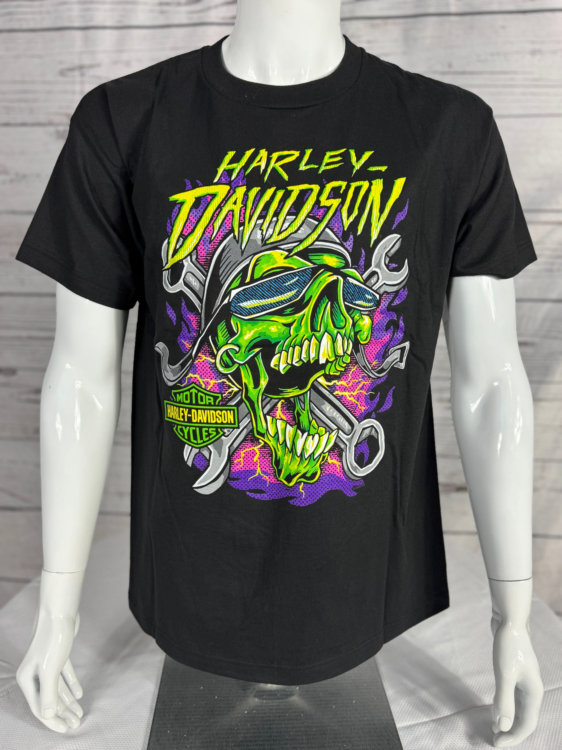 Add a bold edge to your collection with the Harley-Davidson Men's Biker Skull T-Shirt. This striking black tee features a high-contrast graphic of a fierce, yelling biker skull over crossed wrenches, set against a backdrop of fire and lightning. The back proudly showcases our custom Blue Ridge Harley-Davidson logo, making it a must-have for true enthusiasts. Designed for riders who live for the open road, this shirt delivers hardcore style and comfort.