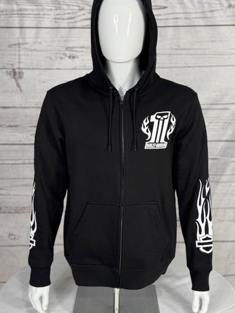 Turn up the heat in the Harley-Davidson® Men’s Dark Flame Hoodie. This full-zip black hoodie ignites your style with contrast flame graphics blazing down both sleeves and a bold flaming Number 1 Willie G on the chest. The back roars with a menacing skull and HD flame design, paired with our exclusive Blue Ridge Harley-Davidson® logo. It’s the perfect layer for riders who live loud and burn bright.