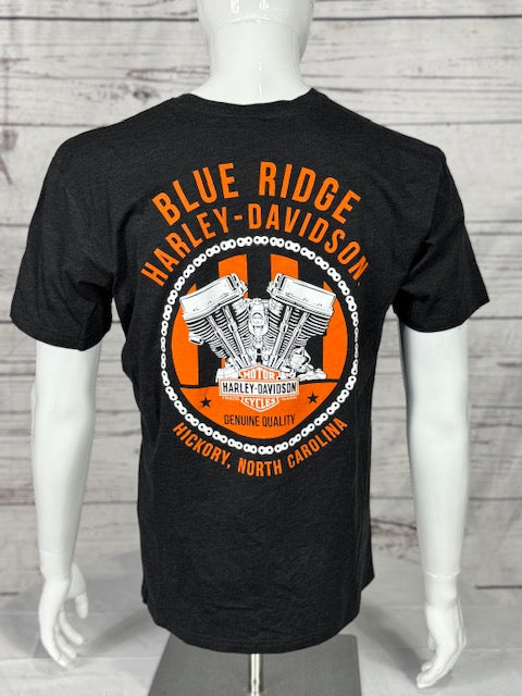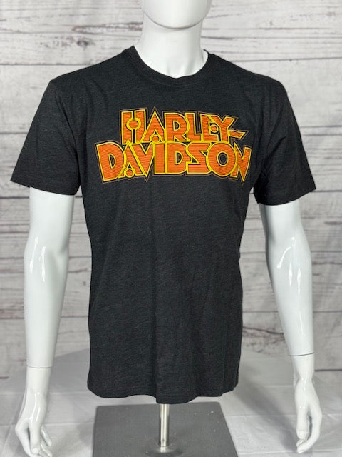 Bring the bold with the Harley-Davidson® Men’s Deco Tee — a throwback to vintage rebellion with a modern edge. The front pops in bright orange and yellow with a retro-style Harley-Davidson® logo that feels straight out of a classic speed shop. Made from a soft cotton-poly blend for all-day wear, this charcoal tee packs power and presence. Turn it around to reveal our exclusive Blue Ridge Harley-Davidson® engine graphic, framed by a chain ring and finished in high-impact orange — a nod to the V-twin legacy that fuels every ride.
