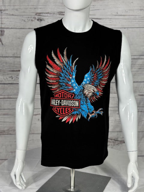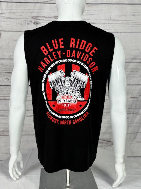 Unleash pure power with the Harley-Davidson® Men’s Devotion Sleeveless Tee — built for those who bleed red, white, and throttle. The front hits hard with a ferocious, full-color bald eagle mid-flight, talons out, clutching the Bar & Shield like it owns the road. Cutoff sleeves keep you cool while showing off your edge. And the back? It brings the thunder with our custom Blue Ridge Harley-Davidson® logo stamped over twin engines and bold red accents — the ultimate badge of honor for those who live loyal, ride hard, and never hold back.