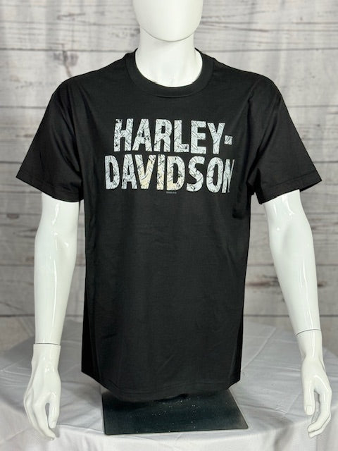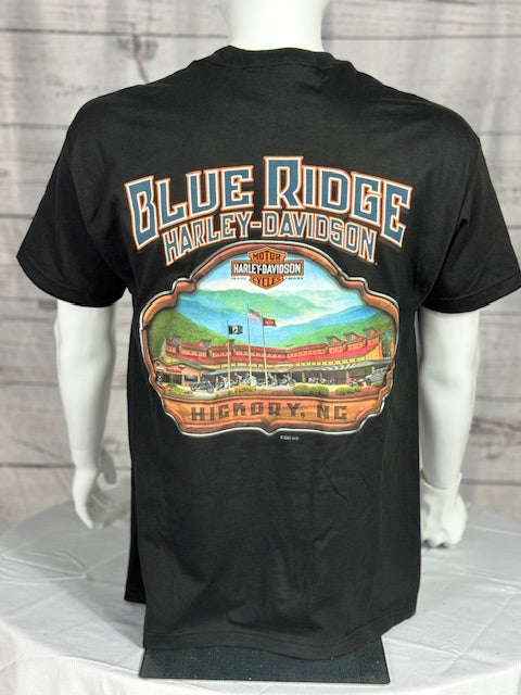 Stand out with the men's black "Diamond Plate" short sleeve dealer t-shirt. The front showcases bold Harley-Davidson lettering in a rugged Diamond Plate design, reflecting strength and durability. The back features our custom Blue Ridge Harley-Davidson storefront logo, adding a signature touch. This tee is perfect for those who appreciate tough, industrial-inspired style with a classic Harley-Davidson edge.