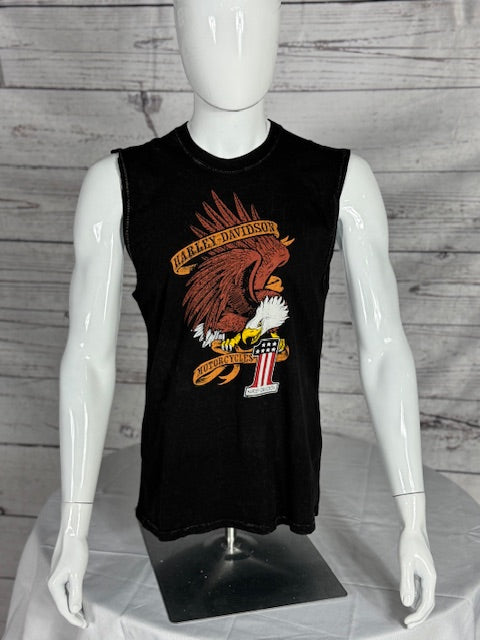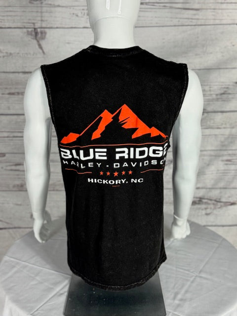 On the back, our custom Blue Ridge Harley-Davidson logo completes the design, connecting you to the legendary Harley-Davidson lifestyle. Made from soft, high-quality cotton with a unique mineral-dyed finish, this sleeveless shirt offers comfort and a distinctive worn-in look.