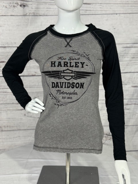 Push boundaries in the Harley-Davidson® Women’s Entwine Raglan Tee — where vintage soul meets modern grit. The two-tone raglan design and rugged “Free Spirit” graphic up front speak to riders who live untamed. Soft fabric delivers all-day comfort with no compromise on style. And when you turn around, the back makes a statement of its own: our Blue Ridge Harley-Davidson® winged logo spreads wide, letting the world know exactly where your loyalty — and your legend — rides.