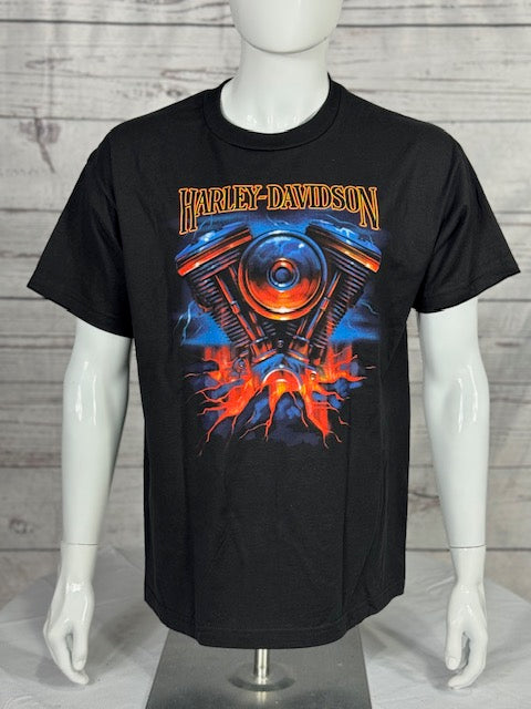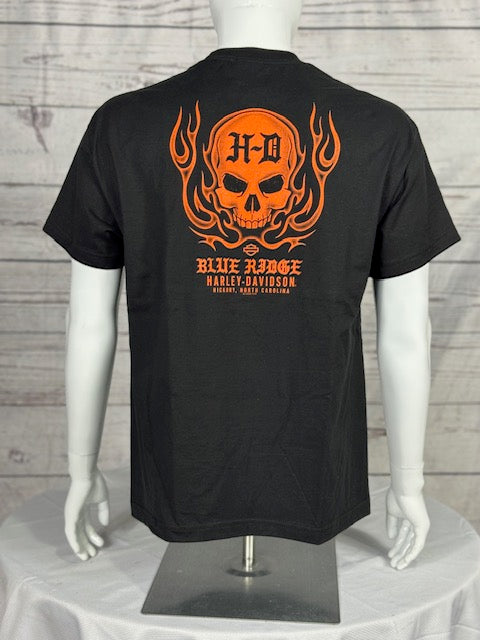 Ignite your look with the Harley-Davidson EVO Eruption Tee. This black tee explodes with a fiery front graphic of a roaring Evolution engine bursting through molten cracks, framed by a bold Harley-Davidson logo up top. The back keeps the heat alive with a flaming orange skull design and Blue Ridge Harley-Davidson logo, proudly repping Hickory, North Carolina. It's built for riders who bring the thunder every time they hit the road.