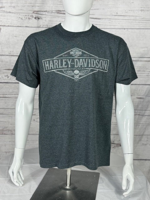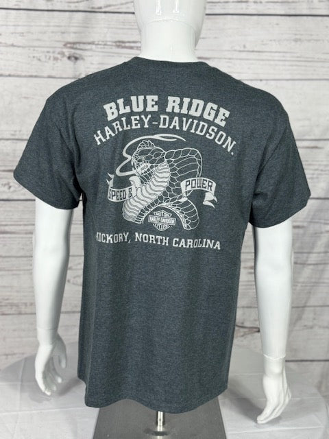 Hit the throttle in the Harley-Davidson® Men’s Fast Lane Tee — a rugged essential for riders who live life wide open. The charcoal heathered tee features a distressed Harley-Davidson® graphic with a skull and crossbones badge, delivering classic rebellion with a vintage punch. Soft and broken-in from day one, it’s built for comfort that keeps up with the ride. The back packs even more punch with our Blue Ridge Harley-Davidson® exclusive cobra graphic — coiled and ready, wrapped in the words “Speed & Power,” and marked with Hickory pride.