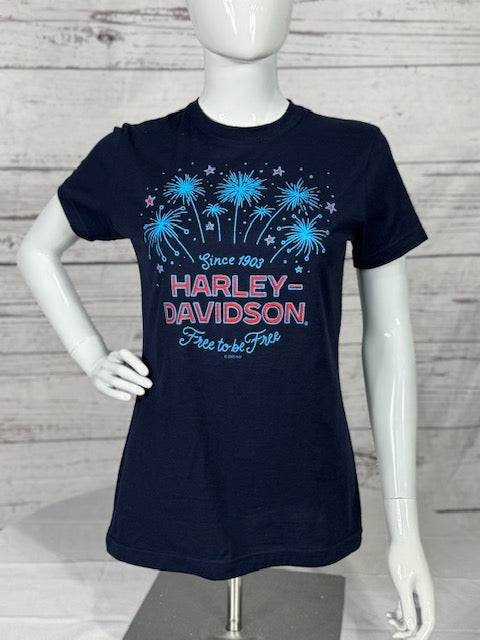 Light up your look with the Harley-Davidson® Women’s Firework Tee — a bold blast of patriotic power made to celebrate freedom in full color. This deep navy shirt features explosive blue fireworks bursting above bright red Harley-Davidson® lettering and a bold “Free to be Free” statement that says it all. Built from soft, breathable cotton, it’s perfect for summer rides, holiday weekends, or any day you want to make some noise. The back seals the deal with our signature Blue Ridge Harley-Davidson® winged logo in vibrant red — a must-have for riders ready to make sparks fly.