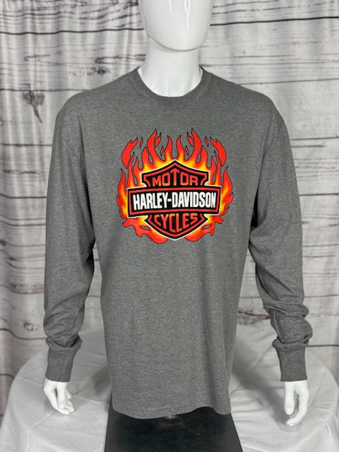 Set the road on fire with the Harley-Davidson Men’s Flamin’ Shield Long Sleeve Tee. The bold Bar & Shield on the chest erupts in blazing orange and red flames, while the sleeve graphics keep the heat alive with fiery detail down the arm. On the back, our exclusive Blue Ridge Harley-Davidson logo delivers authentic dealership pride. Made with a comfortable grey heather fabric, this long sleeve brings serious attitude and all-day comfort—perfect for riders who live to burn bright.