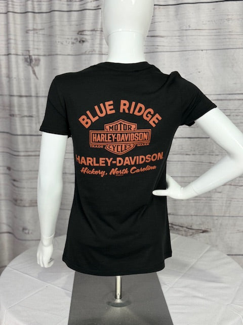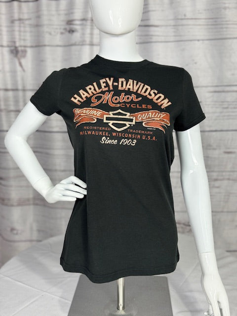 Classic, tough, and unmistakably Harley®, the Women’s Genuine Quality Tee brings iconic style to your everyday ride. The black backdrop sets off a bold vintage-inspired graphic in copper and cream, celebrating Harley-Davidson® heritage since 1903. Flip it around and the back proudly reps our exclusive Blue Ridge Harley-Davidson logo. Comfortable, fierce, and built to stand out—this tee is for the woman who rides with confidence and craves authenticity.