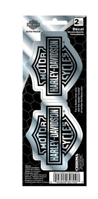 Spruce up your ride with this Small Bar & Shield logo decal set from Harley-Davidson®! Made from high-quality chrome vinyl, these decals will add a touch of style to any smooth, flat surface. The set includes 2 decals, each a chrome 3" x 2.5" iconic Bar & Shield logo. Made in the USA, these decals are a must-have for any Harley enthusiast.