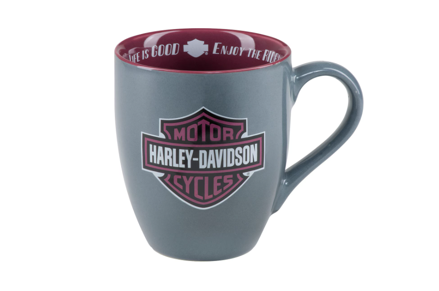 15 oz. / 450 ml grey ceramic mug with purple interior. Bar & Shield logo on front. Life Is Short - Enjoy The Ride motto on inside rim. Dishwasher and microwave safe.