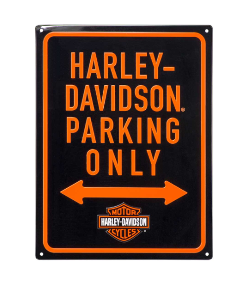 H-D Parking Only Tin Sign. Embossed accents and vibrant colors add depth and dimension. Smooth edges for safe handling. Includes holes for easy hanging.