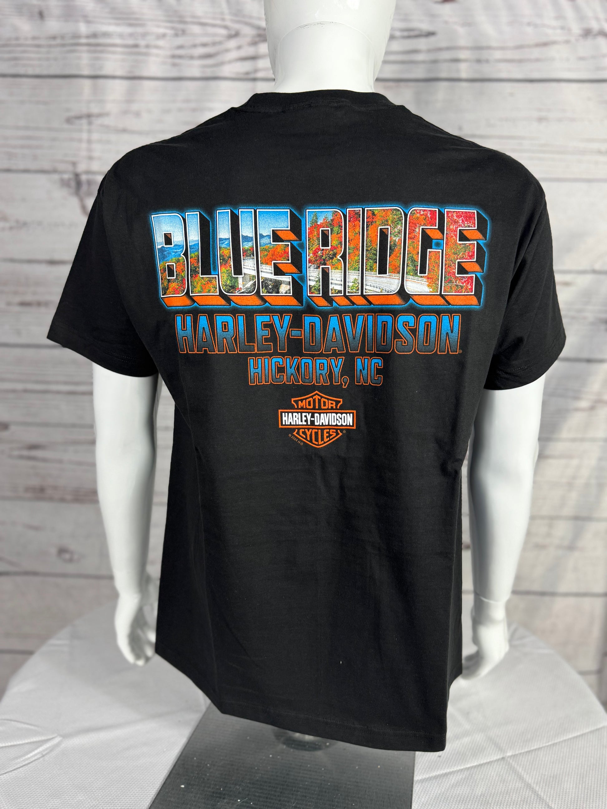 Elevate your casual style with the Harley-Davidson® Men's Black Pocket Tee, featuring a classic and timeless design. A simple yet bold traditional eagle graphic adorns the front pocket, symbolizing the freedom of the open road. The back proudly showcases our custom Blue Ridge Harley-Davidson® logo, adding an exclusive touch to this everyday essential. Crafted from soft, breathable cotton, this short-sleeve tee offers all-day comfort and durability, making it perfect for any rider or enthusiast.