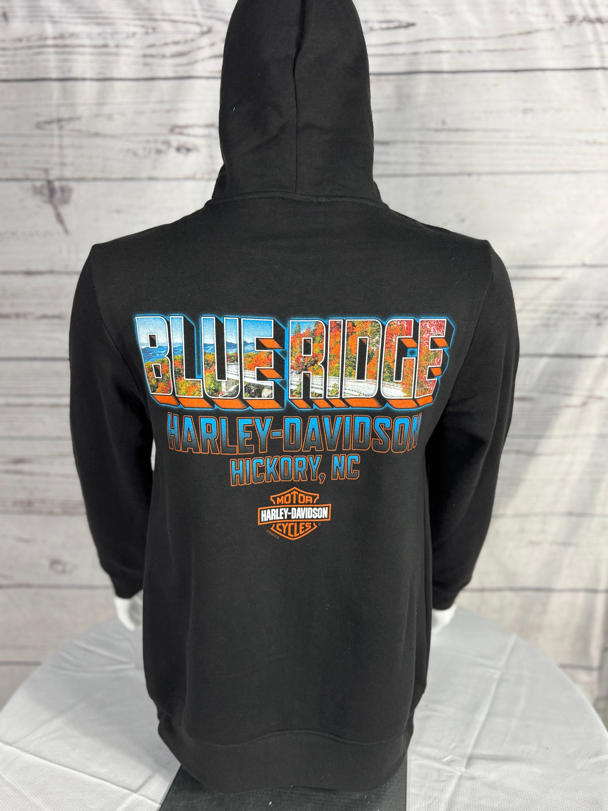 Stay warm and stylish with the Harley-Davidson® Men's Black Zip-Up Hoodie. Featuring a classic traditional eagle graphic on the left chest, this hoodie captures the timeless spirit of Harley® heritage. Made from a soft, comfortable cotton blend, it offers warmth and flexibility for cooler rides or casual outings. The back proudly showcases our custom Blue Ridge Harley-Davidson® logo, making this hoodie a must-have for any true Harley enthusiast. Perfect for layering on the road or off.