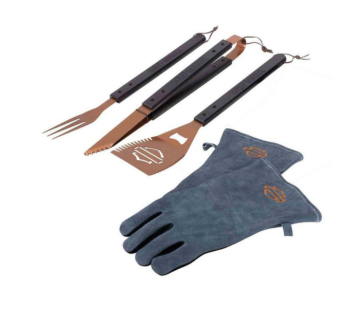 - Design: Each tool is equipped with black wood handles, laser-etched with Harley-Davidson® logos for a rugged, custom look. The spatula also includes a cutout silhouette of the iconic Open Bar & Shield logo.
