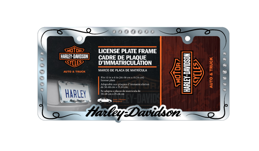 Add a touch of sparkle and elegance to your ride with the Harley-Davidson® Script with Gemstones Premium Metal Auto License Plate Frame. This premium metal frame features the iconic Harley-Davidson script adorned with gemstones, creating a stylish and eye-catching look for your vehicle.