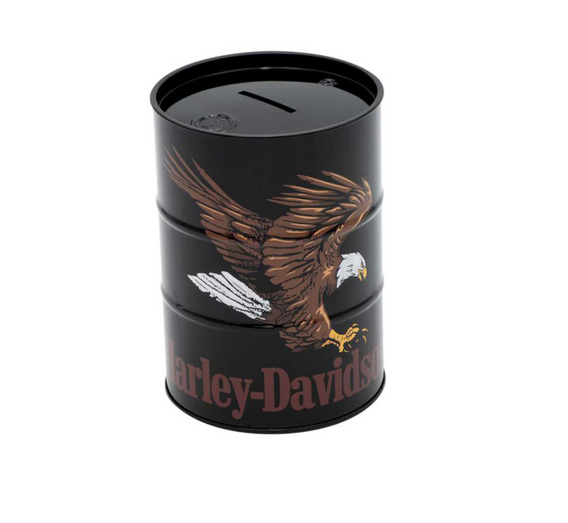 Add a bold touch to your collection with the Harley-Davidson® Swooping Eagle Tin Bank. Shaped like an oil barrel, this bank features a striking Swooping Eagle graphic and a sleek solid black finish. The removable lid ensures easy access to your savings. A must-have for any Harley enthusiast!