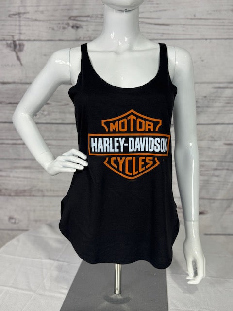 Bring the iconic style with the Harley-Davidson® Women’s Black Tank Top. Featuring the classic Bar & Shield logo in bold orange and white across the front, this tank delivers timeless Harley-Davidson® attitude with a sleek, no-fuss silhouette. Perfect for sunny rides or laid-back days, the lightweight fabric and relaxed fit offer all-day comfort and cool breathability. The back proudly showcases our custom Blue Ridge Harley-Davidson® logo with striking flaming wings and “Hickory, North Carolina” script, making it a must-have for any rider looking to rep their favorite dealership in standout style.