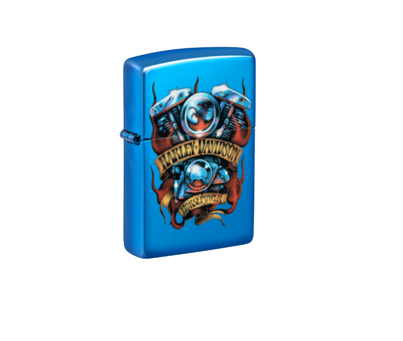 The Harley-Davidson® Zippo 46216 Lighter features a stunning high polish blue finish with a vibrant full-color design, showcasing the iconic Harley-Davidson® style in a bold, eye-catching way.
