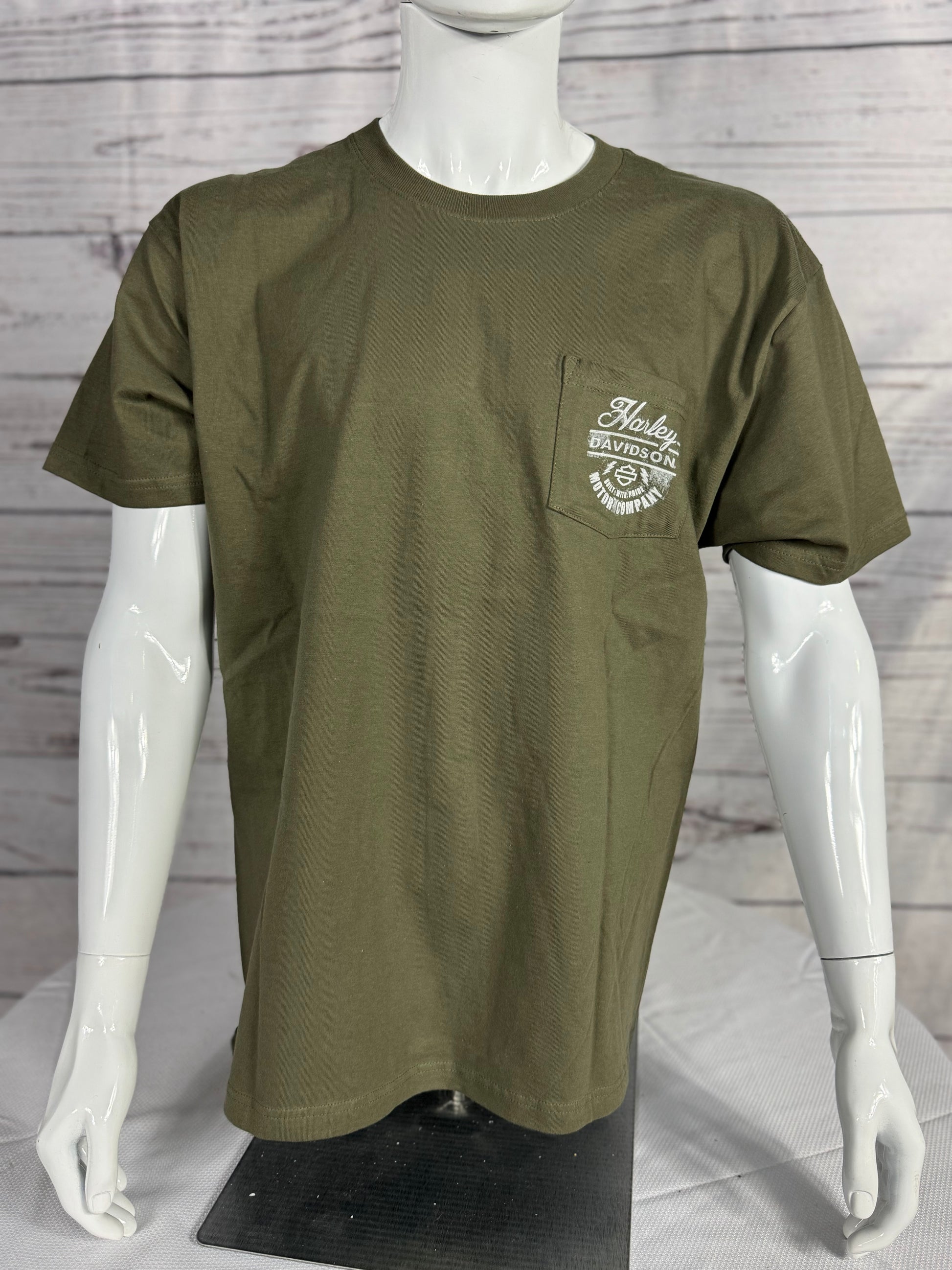 Stay classic and comfortable with the Harley-Davidson Men's Harley Strike Pocket T-Shirt in the color grape leaf. This short-sleeve tee features a sleek Harley-Davidson Strike Logo on the front pocket for a subtle yet bold statement. Crafted from soft, breathable cotton, it offers all-day comfort and durability. The back proudly showcases our custom Blue Ridge Harley-Davidson logo, making it a must-have for any dedicated rider or enthusiast.