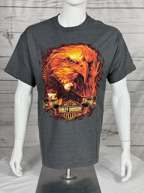 Make a fierce statement with the Harley-Davidson Legend Rides On Tee. This charcoal tee unleashes a blazing eagle graphic across the chest with the iconic bar and shield, framed by the words “The Legend Rides On.” The back brings the fire with an orange flaming skull and bold H-D lettering above the Blue Ridge Harley-Davidson logo—representing Hickory, North Carolina. It’s pure attitude, front to back, built for those who ride with pride.