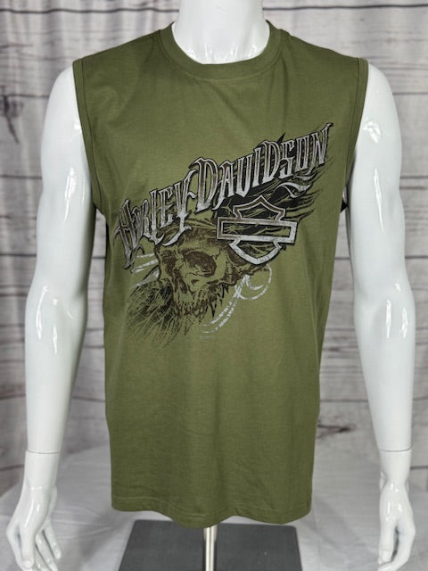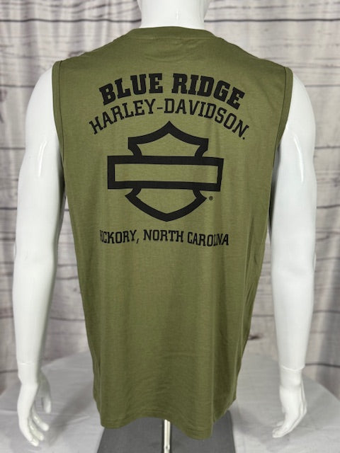 Turn up the attitude with the Harley-Davidson® Men’s Loco Sleeveless Tee. This olive-green muscle shirt brings hardcore energy with its distressed skull and Bar & Shield graphic that screams rebellion. Perfect for the open road or a summer rally, it delivers comfort and edge in equal measure. The back proudly reps Blue Ridge Harley-Davidson® – Hickory, North Carolina, letting everyone know where true riders roll from.
