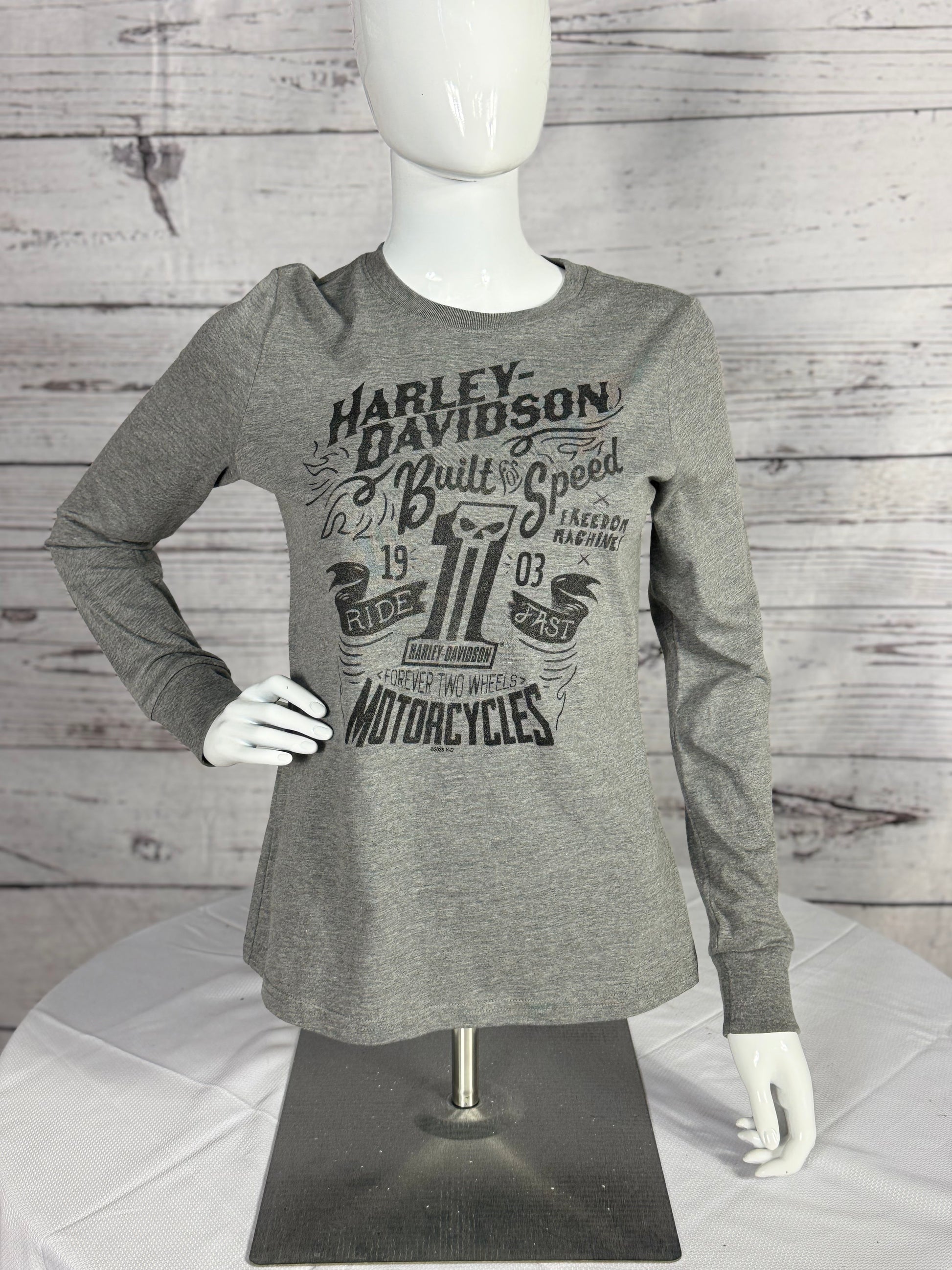 Rev up your wardrobe with the Harley-Davidson® Women's Grey Long Sleeve Tee. Featuring a contrast black distressed Willie G "Built for Speed" design on the front, this tee combines classic Harley® spirit with a bold, vintage edge. Crafted from soft, breathable fabric, it offers comfort and a flattering fit for everyday wear. The back proudly showcases our custom Blue Ridge Harley-Davidson® logo, making this long sleeve tee a perfect blend of style, heritage, and performance.