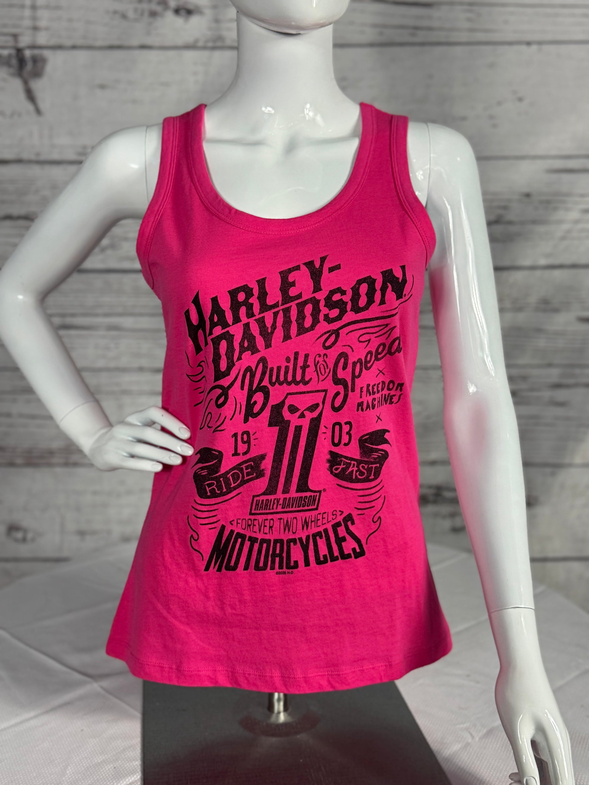 Make a bold statement with the Harley-Davidson® Women's Bright Fuchsia Tank Top. Featuring a striking contrast black distressed Willie G "Built for Speed" design on the front, this tank top captures the essence of Harley® heritage with a modern edge. Crafted from soft, breathable fabric, it offers comfort and a flattering fit perfect for warmer days. The back proudly displays our custom Blue Ridge Harley-Davidson® logo, making this tank top a standout addition to any rider's collection. Perfect for a ride or casual outing, it combines style and Harley® spirit effortlessly.