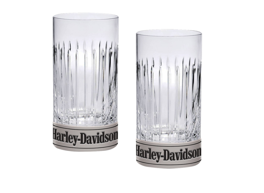 Own a set of two 16 oz. / 480 ml highball glasses boasting hand-cut accents and a custom tooled metal base adorned with an embossed Harley-Davidson logo. Hand wash only!