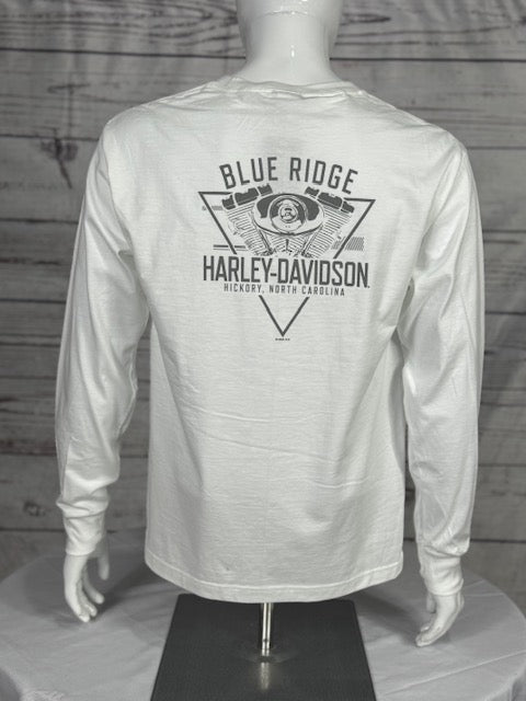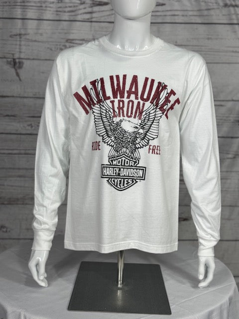 Unleash your inner rebel in the Harley-Davidson® Men’s MKE Iron Long Sleeve Tee. This crisp white shirt captures the soul of freedom with a commanding eagle perched atop the legendary Bar & Shield, flanked by bold Milwaukee Iron lettering. It’s a salute to riders who live wide open and ride even harder. The back cranks up the attitude with our exclusive Blue Ridge Harley-Davidson® logo—built for legends, not for limits.