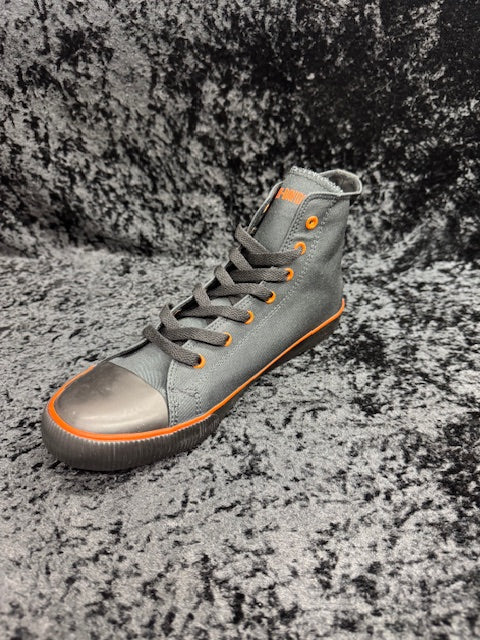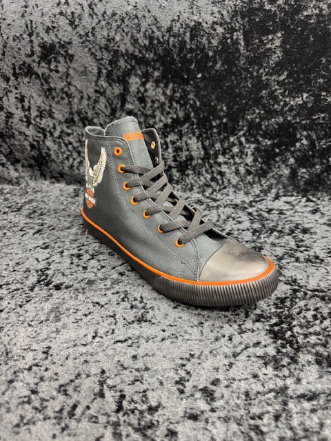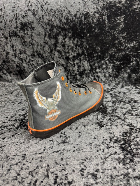 Bring bold Harley-Davidson attitude to your everyday look with the Men’s Nathan Eagle. This classic high-top sneaker is crafted from durable canvas and finished with the iconic H-D® eagle logo on the side, delivering timeless style and unmistakable pride. Built for comfort with a vulcanized rubber outsole and textile lining, it’s the perfect balance of casual wear and Harley spirit—whether you’re on the move or kicking back after the ride.