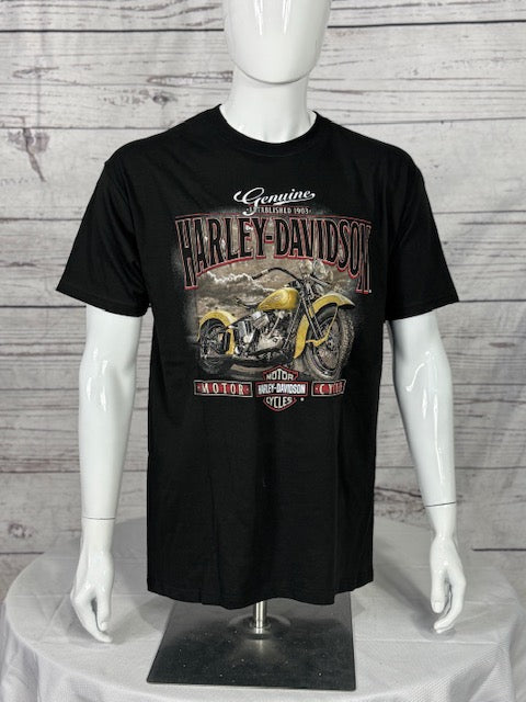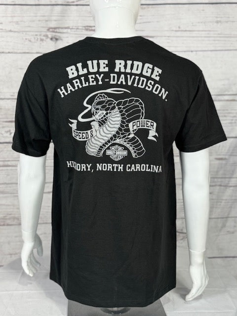 Roll with legendary pride in the Harley-Davidson® Men’s Noble Tee — a tribute to grit, heritage, and the raw power of American iron. The front showcases a weathered custom bike in yellow and chrome, framed by classic Harley-Davidson® script and “Genuine” callout, channeling old-school confidence and road-earned style. Crafted from all-day cotton comfort, this tee doesn’t just show up — it shows out. The back brings the bite with our Blue Ridge Harley-Davidson® cobra graphic and “Speed & Power” banner, marking your ride with venom and hometown loyalty.