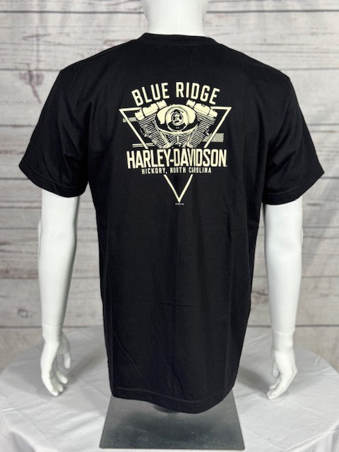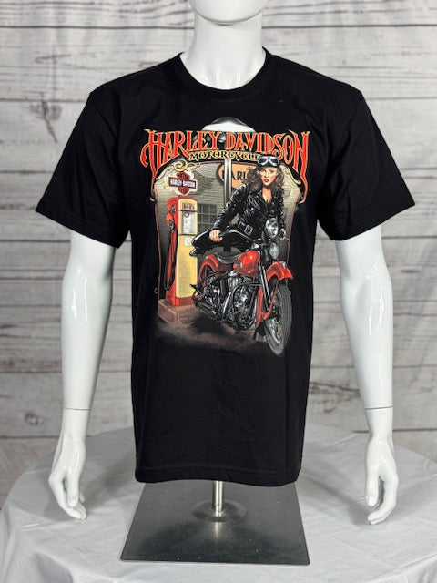 Bring retro rebellion to your wardrobe with the Harley-Davidson Pinup Ride Tee. This black tee features a throwback-style graphic of a vintage pinup perched on a classic Harley at an old-school gas pump, exuding timeless attitude with every detail. The back balances boldness with a clean Blue Ridge Harley-Davidson logo and engine art, giving a nod to Hickory, North Carolina. It's a perfect mix of pinup flair and V-twin pride.