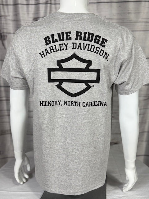 Turn up the heat with the Harley-Davidson® Men’s Piston Pin-Up Tee — a throwback to the golden age of American muscle and style. The front graphic features a vintage-inspired pin-up girl posing beside a detailed piston design, capturing that perfect blend of grit and glamour Harley® is known for. Set on a soft athletic gray backdrop, this tee brings both comfort and classic cool to your everyday look. The back proudly displays our Blue Ridge Harley-Davidson® – Hickory, North Carolina logo, sealing it as an exclusive piece of hometown pride and pure Harley® attitude.