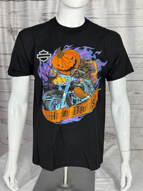 Ride into the night with the Harley-Davidson Men’s Pumpkin Ride Tee. This black tee unleashes a wickedly bold front graphic featuring a pumpkin-headed rider tearing through purple flames on a classic Harley, blending spooky vibes with pure road power. Perfect for Halloween rides—or anytime you want to bring that hauntingly cool energy—this tee is all attitude. On the back, our exclusive Blue Ridge Harley-Davidson logo adds the finishing touch of local pride.
