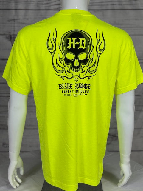 Turn up the intensity with the Harley-Davidson Rad Skull Tee in safety yellow. This high-impact shirt features a fierce, mechanical skull graphic tearing through stylized flames and bold H-D lettering on the front. The back showcases a flaming skull with the Blue Ridge Harley-Davidson logo, making it loud, fearless, and impossible to miss. If you want to stand out while repping serious attitude, this tee gets the job done.
