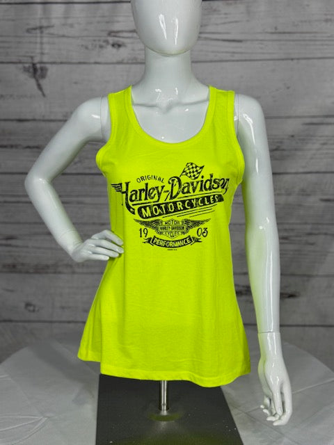 Get loud, ride proud in the Harley-Davidson® Women’s Rally Ready Tank. This safety yellow tank commands attention with a bold racing-inspired front graphic featuring the Harley-Davidson® name, checkered flag, and “Built for Performance” tagline. Its relaxed scoop neck cut keeps things cool, while the back fires up with our exclusive Blue Ridge Harley-Davidson® logo—complete with an engine and triangle graphic celebrating Hickory, North Carolina. Made for rallies, rides, and raising hell.