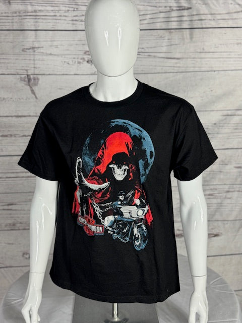 Rev up your style with this bold men's short-sleeve t-shirt. Featuring a striking Grim Reaper in a red cloak alongside a classic low rider, this design exudes attitude and edge. Made from soft, durable cotton, the black backdrop enhances the vibrant artwork, making it a standout piece in any wardrobe.