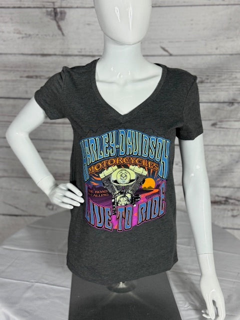 Answer the call of the open road with this women’s grey short-sleeve v-neck t-shirt. The front features a retro groovy "The Road is Calling" Harley-Davidson design, blending vibrant, vintage-inspired graphics with a carefree biker vibe.