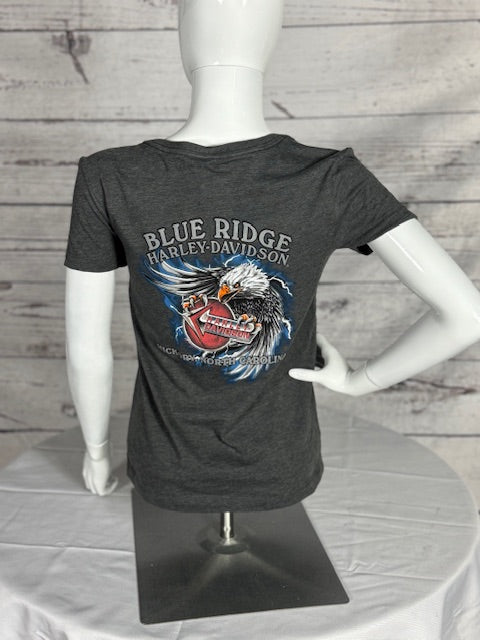 The back is adorned with our custom Blue Ridge Harley-Davidson® logo, adding a unique and personal touch. Crafted from soft, breathable cotton, this v-neck tee offers a flattering fit and all-day comfort, perfect for your next adventure.