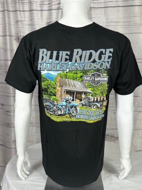Bring vintage flair to your wardrobe with the Harley-Davidson® Men’s Rosie Tee. This bold black shirt features a classic pin-up inspired graphic showcasing Rosie beside a retro red Harley®, framed by the legendary Bar & Shield logo and “Established 1903” design. Perfect for riders who appreciate old-school attitude with modern comfort. The back proudly highlights our Blue Ridge Harley-Davidson® – Hickory, North Carolina logo, celebrating true American craftsmanship and style.