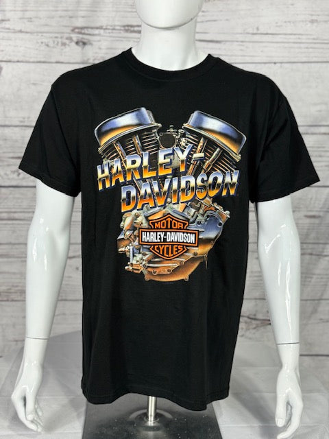 Turn up the volume with the Harley-Davidson® Men’s Rumble Tee. This high-impact black short sleeve features a full-throttle V-twin engine graphic roaring with rich chrome and copper tones—framed by the iconic Harley-Davidson® logo in a bold, explosive style. Made from soft cotton that keeps you cool and ready to ride. The back drives it home with our exclusive Blue Ridge Harley-Davidson® logo in fierce orange and silver, honoring the heart of Hickory, North Carolina.
